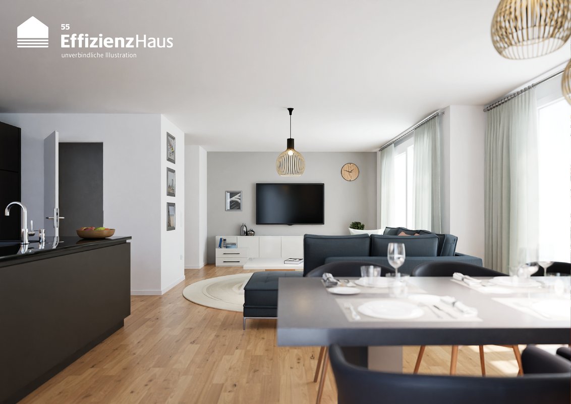 • Helle Räume: Große Fensterfronten sorgen für eine lichtdurchflutete Atmosphäre und schaffen ein angenehmes Wohnklima.